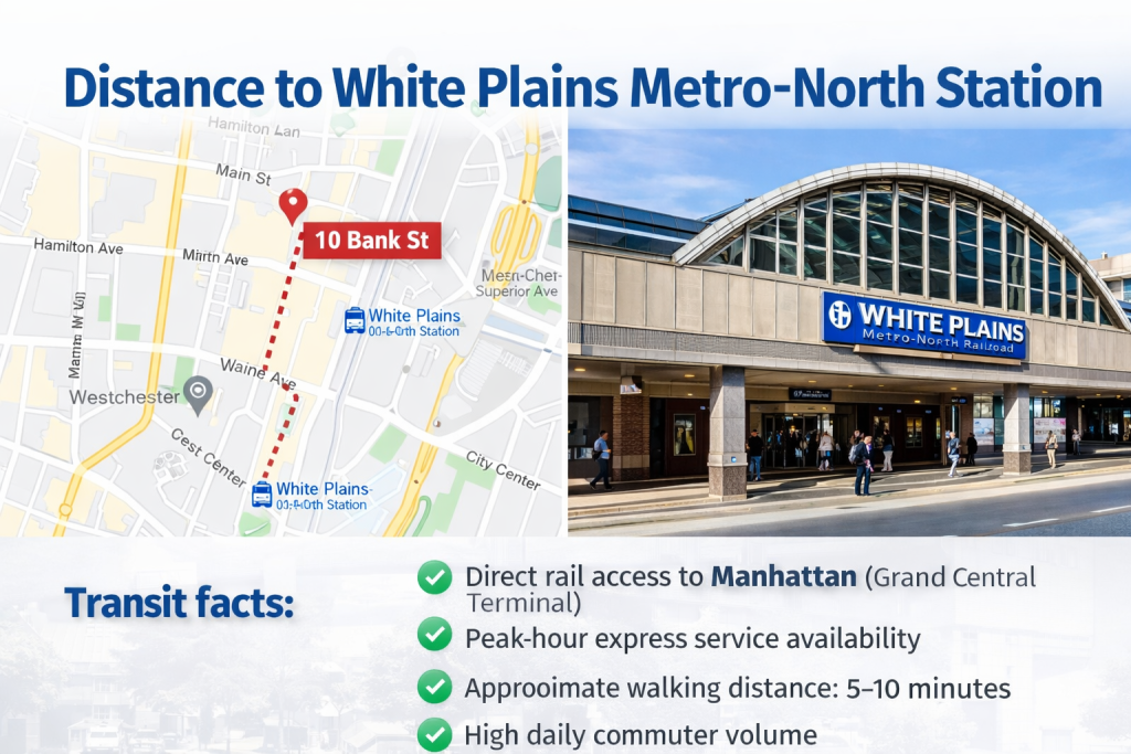 Yes. The property is within walking distance of the White Plains Metro-North commuter rail station, which provides direct service to Manhattan and regional destinations throughout Westchester County.