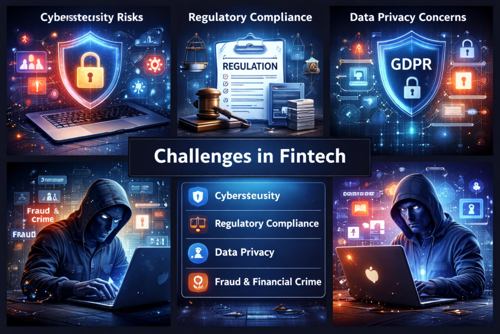 Fintech faces cybersecurity threats, regulatory compliance challenges, data privacy concerns, and potential fraud or financial crime.